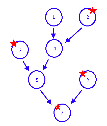 The image above shows an example of a part of a tech tree. Tech #1 can be developed freely, the only requirements is having enough tech points. Techs #2, #3 and #6 are marked with a start and need a blueprint to unlock their development. Techs #4 and #5 need previous techs in order to be developed (#1 and #2, and #3 and #4 respectively). Tech #7 needs a blueprint AND tech #5 and #6 to be unlocked.